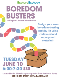 Design your own boredom-busting activity kit using reclaimed and repurposed materials with Guest Artist Claire Giroux! In this creative reuse workshop, you'll craft a custom collection of DIY games, playful prompts, and hands-on fun perfect for on-the-go entertainment. This workshop has something for everyone: parents looking for new activities, friends looking to level up game night, or couples looking to spice up date night!
