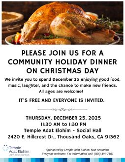 Need a warm meal on Christmas Day? Local community members in need are invited to join Temple Adat Elohim in their festively decorated social hall, located at 2420 E. Hillcrest Drive, Thousand Oaks, for a delicious hot turkey meal with all the fixings.