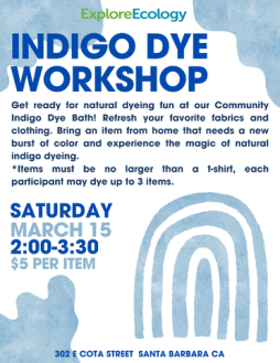 Get ready for natural dyeing fun at our Community Indigo Dye Bath Workshop. Refresh your favorite fabrics and clothing. Bring an item from home that needs a new burst of color and experience the magic of natural indigo dyeing. Our staff will guide you through the dyeing process and help you transform your chosen piece into a vibrant, one-of-a-kind creation. Items must be no larger than a t-shirt, each participant may dye up to 3 items. The cost is $5 per item. Pre-registration is not necessary.