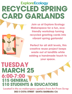 Join us at Explore Ecology Makerspace for a fun, eco-friendly workshop turning recycled greeting cards into vibrant spring garlands! Learn simple cutting and stringing techniques to transform old cards into festive décor. Perfect for all skill levels, this creative reuse project keeps waste out of landfills while adding a handmade touch to your space. Cost: $15 general, $10 for students/educators. Let’s craft sustainably!