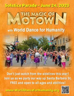 No need to watch from the sidelines this year - come party up Santa Barbara Street with World Dance for Humanity! Practices are FREE and FUN! The theme is Motown, and the costumes are DIY 1960s. Just attend a World Dance class to sign up, learn the dances in-person or online.