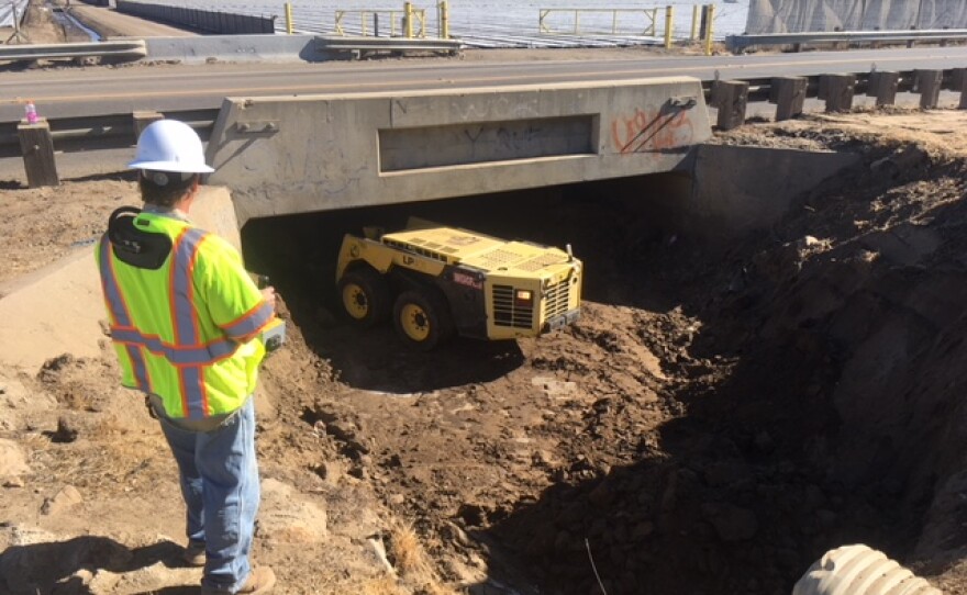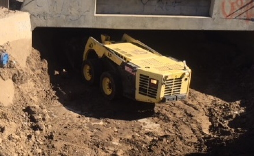 What looks like a scaled down bulldozer is clearing mud from a creek bed under a bridge on Central Avenue, west of Camarillo. It’s called a skid steer, and it’s a robot controlled by a man standing on the creeks bank with what looks like a video game controller. The gear allows crews to clear debris from areas too dangerous for manned equipment, as well as under bridges too low for conventional bulldozers.