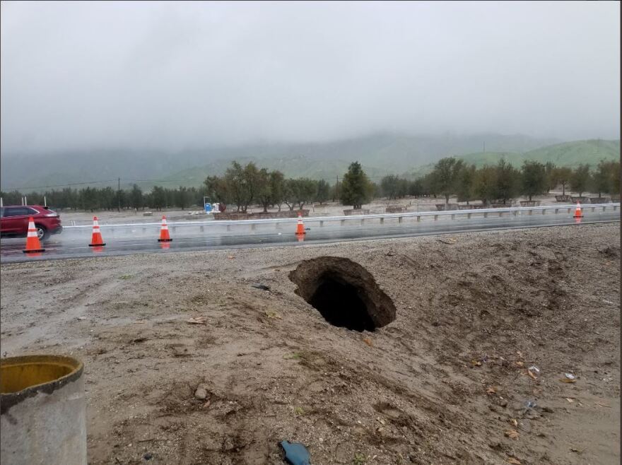 A sinkhole has developed next to a state highway in Ventura County following recent storms, closing one of its lanes indefinitely. The damage is on Highway 126 about a half mile east of Piru.