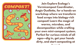 Join Explore Ecology’s Vermicompost Coordinator, Angie Ouellette, for a hands-on workshop where we transform food scraps into nutrient-rich compost! Learn the magic of worms, microbes, and decomposition while crafting your own mini-compost system using reclaimed containers. These bins are for every lifestyle! Big enough to be used for families, but versatile and easy to use, and can even live out on a back patio if needed! Discover how creative reuse reduces waste and supports a healthier planet. Perfect for curious minds of all ages—dig in, get your hands dirty, and start composting at home!